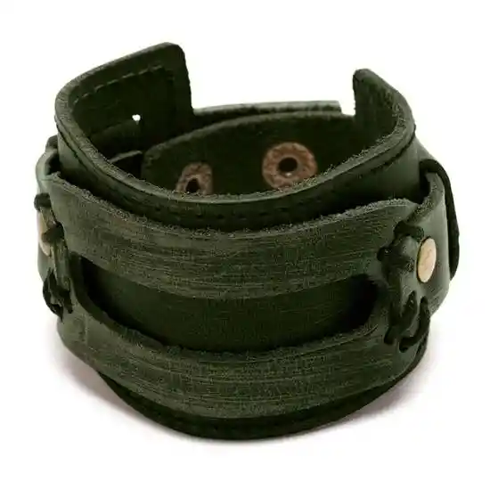 Pulsera Tipo Brazalete Ancho en Cuero Color Verde. Detalles y Broche a Presión en Bronce. Cuenta Con Dos Medidas de Ajuste. 18 21 cm (Diámetro) Ajustable