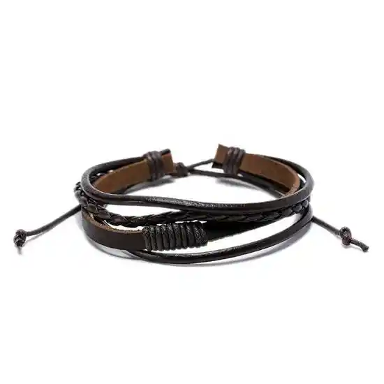 Pulsera Brazalete de Cuero Color Café Con 4 Texturas de Cuero. Ajustable a la Muñeca. 16 cm (Diámetro) Ajustable