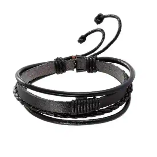 Pulsera Brazalete de Cuero Color Negro Con 4 Texturas de Cuero. Ajustable a la Muñeca. 16 cm (Diámetro) Ajustable