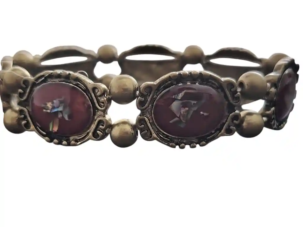 Pulsera de estilo vintage compuesta por piezas ovaladas en tono burdeo de acabado brillante, con delicados detalles internos decorativos. Sus elementos metálicos con diseño ornamental unen cada pieza, aportando un carácter clásico y sofisticado. Un accesorio con presencia, ideal para elevar looks elegantes o dar un toque distintivo a atuendos contemporáneos.