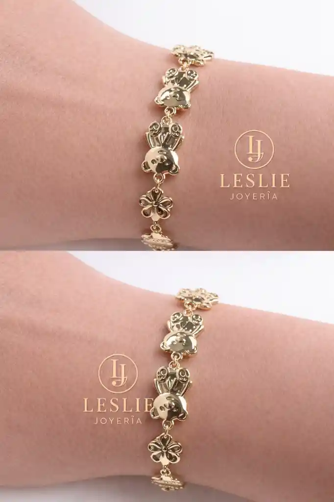 Pulsera con hermoso diseño de osito laminada en oro de 18k mide 18cm más 5cm de extensión.