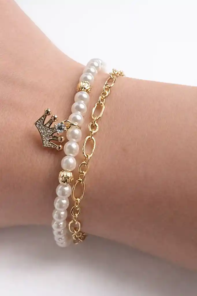 Pulsera con elegante diseño de perlas y eslabones modernos con coronita con cristal y micro circones laminada en oro de 18k mide 16cm más 5cm de extensión.