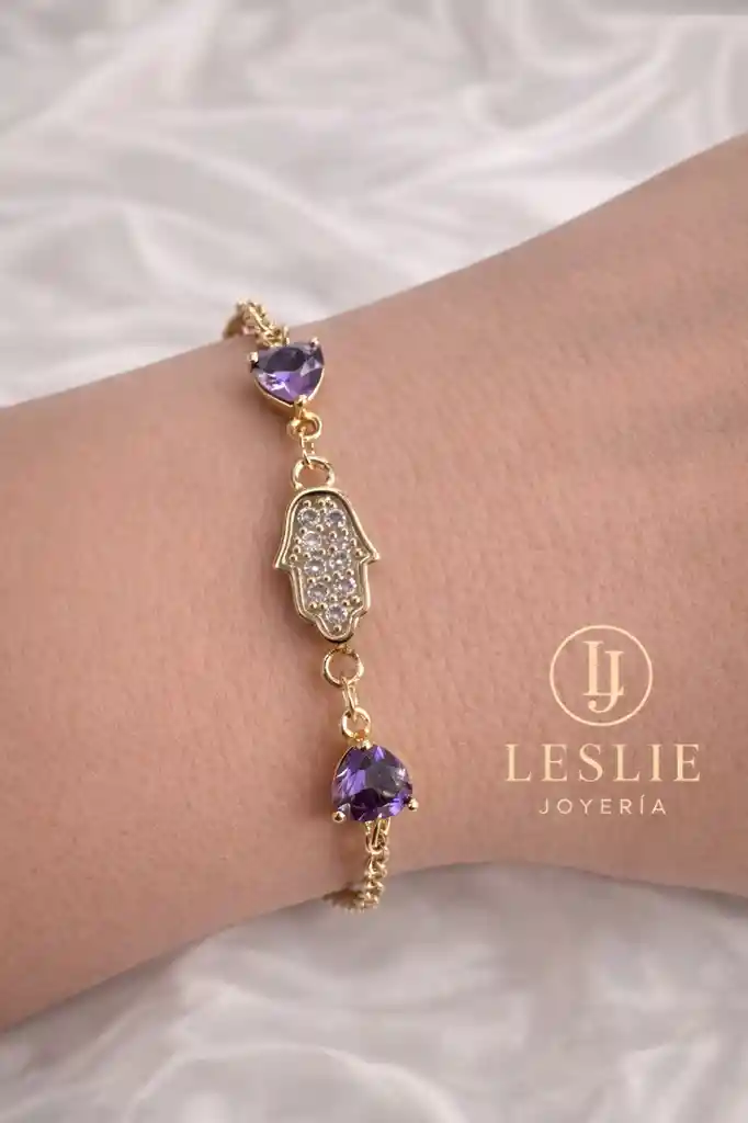 Pulsera con mano de fatima con micro circones y cristales morados laminado el oro color rose de 18k mide 20 cm.