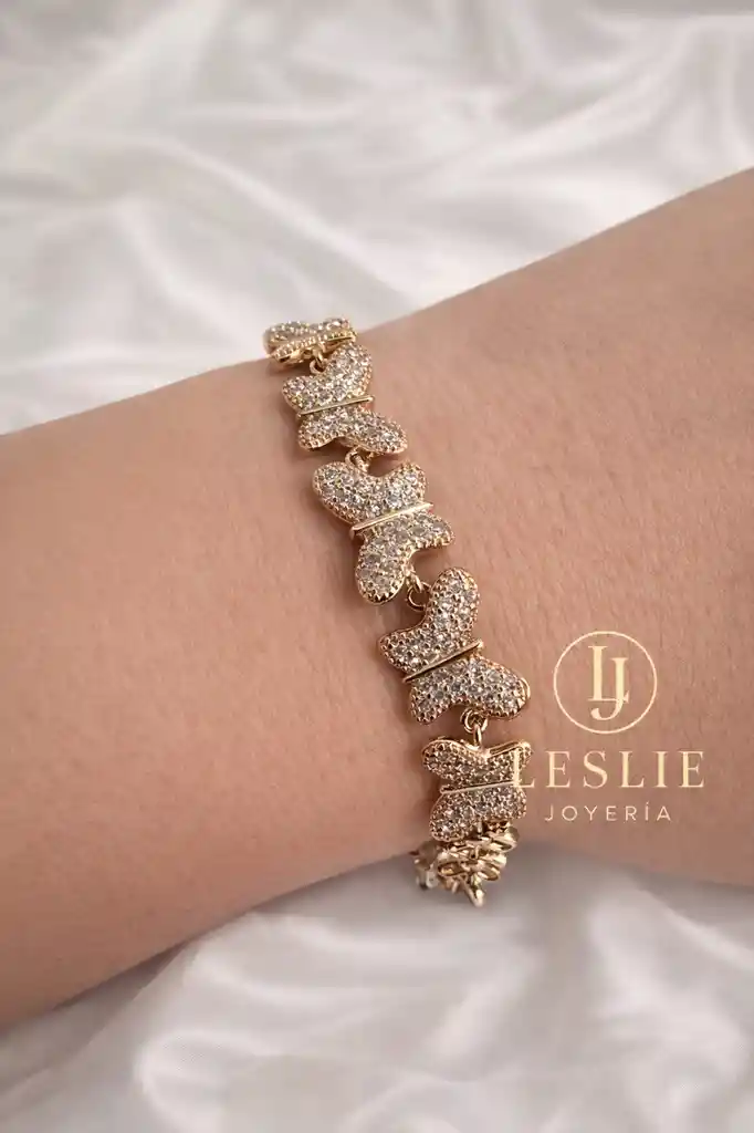 Pulsera con mariposas con micro circones y cristales laminado en oro color rose de 18k mide 21cm.