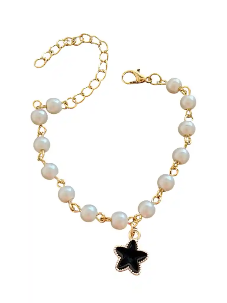 Pulsera bañada en oro, compuesta por pequeñas perlas de acabado suave y uniforme que aportan un estilo delicado y femenino. Incorpora un dije colgante en forma de estrella en color negro, que crea un elegante contraste y añade un toque moderno al diseño clásico. Cuenta con broche y cadena de extensión para un ajuste cómodo y seguro. Ideal para usar sola o combinar con otras pulseras, perfecta para looks sofisticados tanto de día como de noche.
