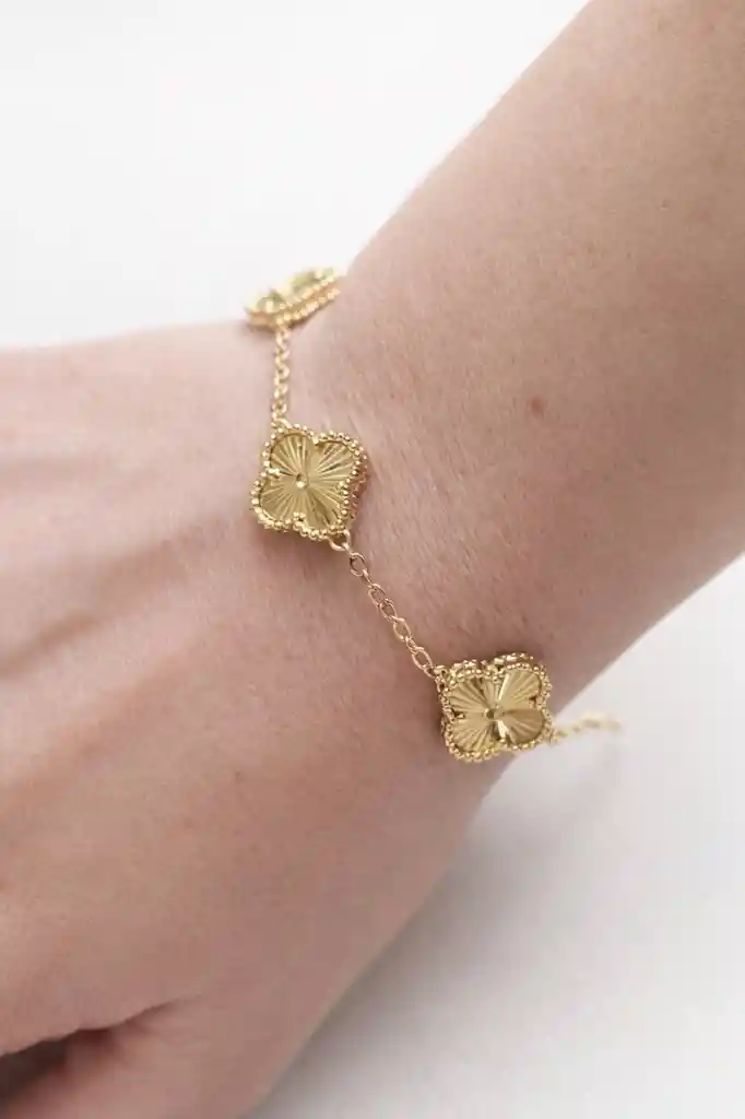 Pulsera con tres trébol laminado en oro de 18k mide 21cm.