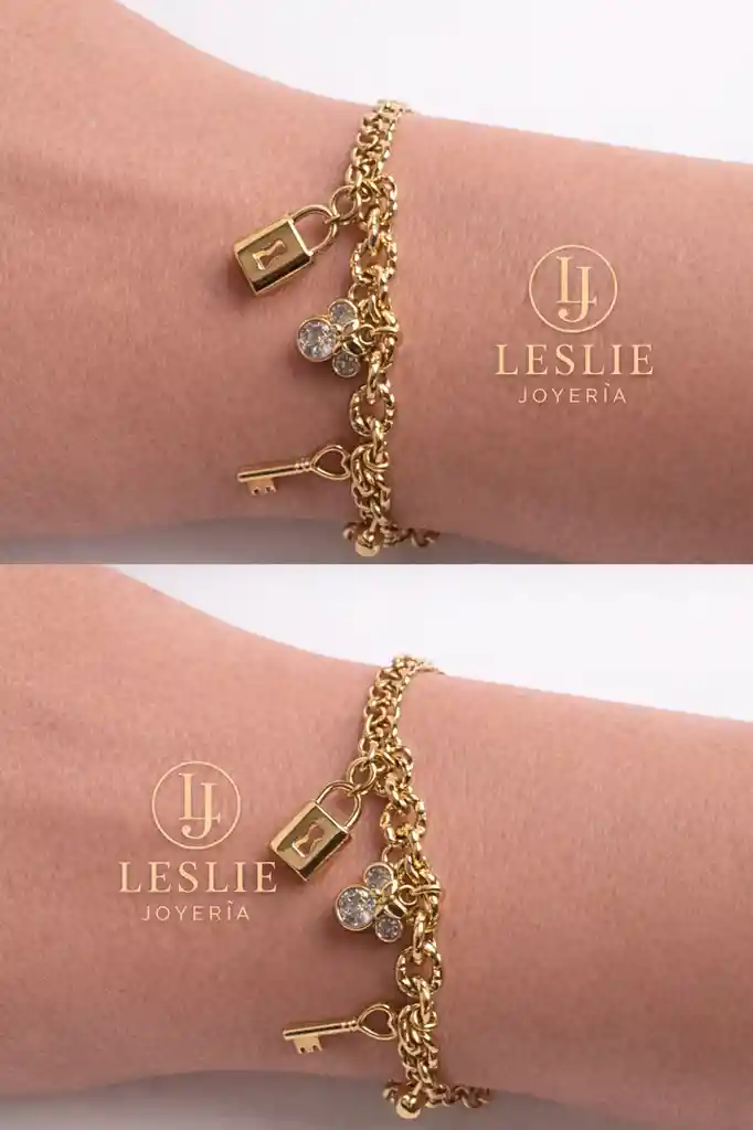 Pulsera con precioso diseño varios dije laminada en oro de 18k mide 17cm.