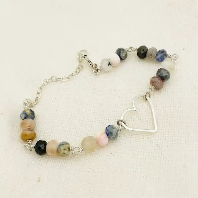 Pulsera de piedras y Cuarzos naturales con un Corazón de plata hecho a mano al centro de la pulsera. La pulsera mide 16cm hasta 20cm con su cadenita de alargador.