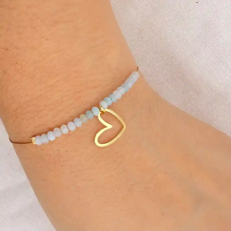 Pulsera de la marca Caroco, piedras Amazonita naturales sobre hilo de acero dorado con un corazón al medio. y terminado con una pequeña cadena. Largo total desde 16cm hasta 21cm. para poder ajustarlo a la medida de cada muñeca. Terminaciones de bronce bañado en oro de 18k.