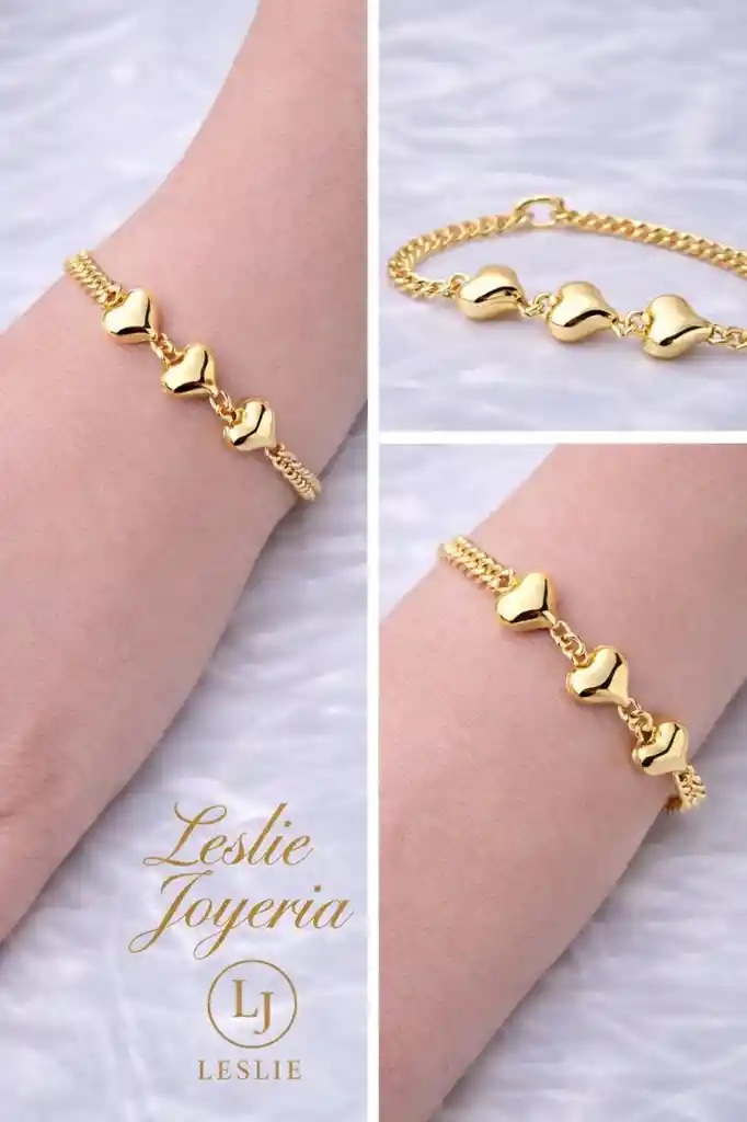 Pulseras con diseño de corazones inflados laminado en oro de 14k mide 21cm.