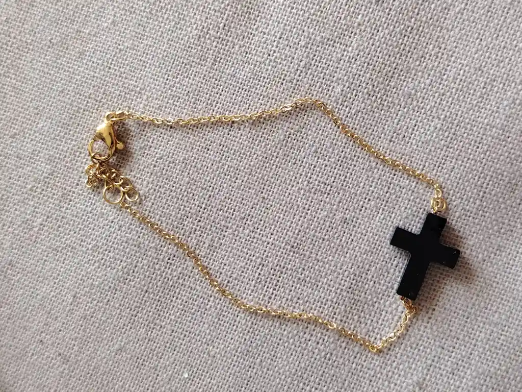 Pulsera delicada con cruz negra y cadena bañada en oro, ideal para un look minimalista y con significado.