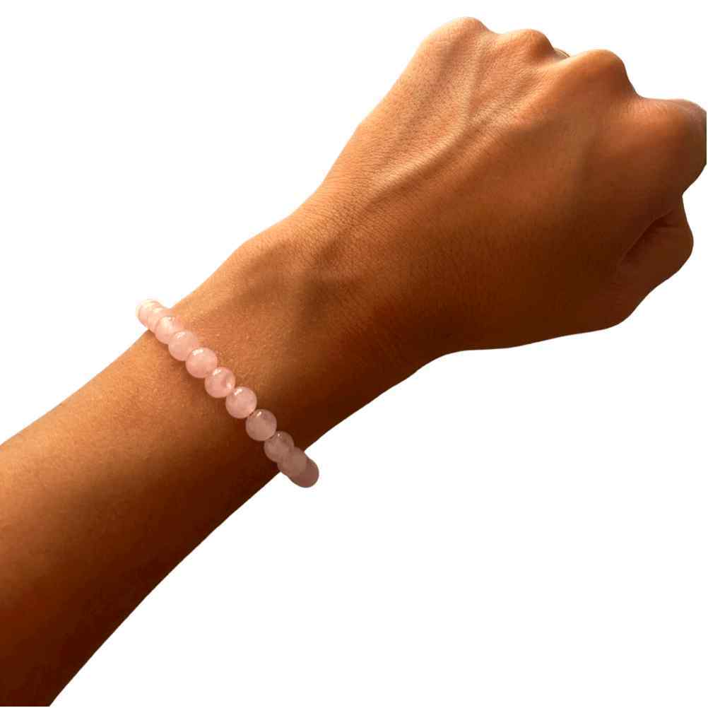 Preciosa pulsera de cuarzo rosa, conocida como la piedra del amor, entrega paz, ayuda a calmar las emociones, refuerza las relaciones y el amor propio… un must en tu vida! Especial para sentirte protegida y darle un look especial a tus outfits.Tamaño pulsera: 18 cm aprox, elasticada y reforzada.Tamaño piedras de cuarzo 6 mm. Al ser una piedra natural, el color puede variar desde el rosa más oscuro a un rosa mas clarito.Incluye: tag con las propiedades del cuarzo y una bolsa para guardarla.¿Sabías que el Cuarzo recoge la energía, la potencia y la dirige hacia donde tú quieras? Es muy utilizado para sanar y eliminar las energías negativas por sus propiedades curativas.El cuarzo rosa es una piedra de sanación muy usada a lo largo de la historia, te encantará.Ideal para regalar a esa persona en especial o a ti misma!