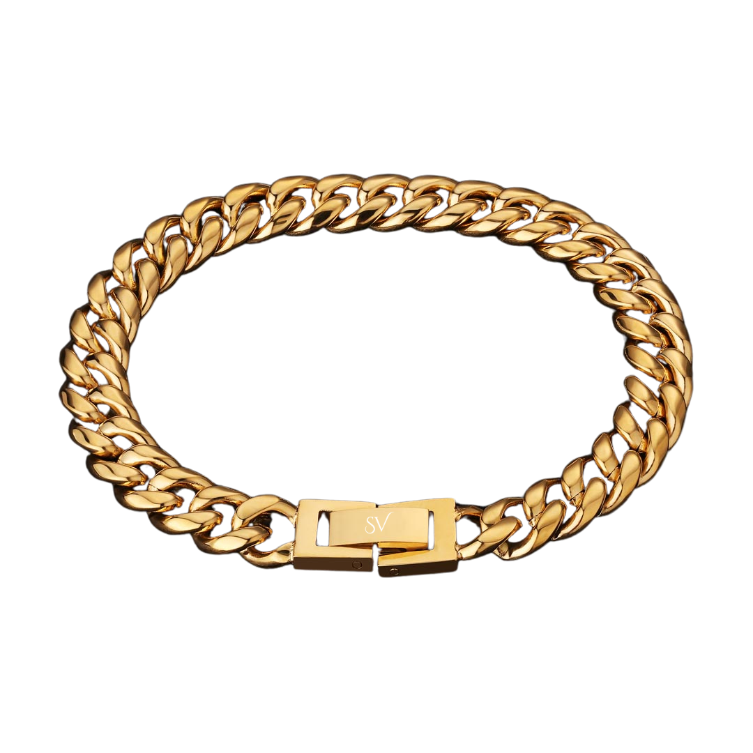 La Pulsera Cuban Oro de Saint Venik con su tipo de eslabón y grosor predominante permite generar un estilo y aura único en quién la utiliza. Destaca con facilidad entre la multitud. CARACTERÍSTICAS ✓ Acero inoxidable 316L ✓ Enchapado Oro 18k 2.5 micras ✓ Resistente al agua, sudor y calor ✓ Hipoalergénico (sin piel verde) Broche: Brazalete. Grosor: 8mm. Tamaño: 20cm. El cumplido preferido que han recibido nuestros clientes → "Qué linda se te ve...Me encanta que uses Accesorios"