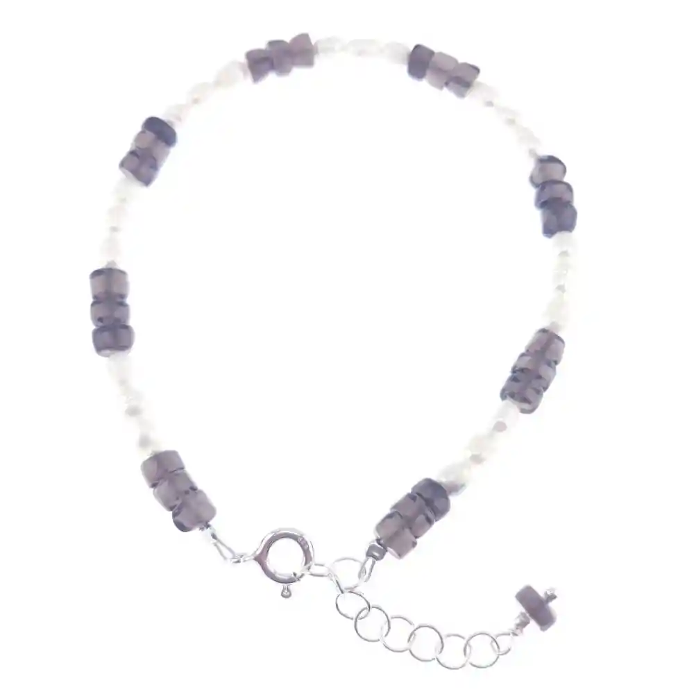 Pulsera de piedra natural de cuarzo ahumado rondel de 0,4 cm. Perla natural de río ovalada de 0,3 cm. Broche, cadena de 2,5 cm de largo y conector de plata 925. Largo 18 + 2 cm. Cuarzo Ahumado: combate los estados depresivos, elimina la negatividad. Perlas de río: elimina todo tipo de miedos y angustias. Incluye: bolsa de regalo Cambios: 1 mes Garantía: 3 meses