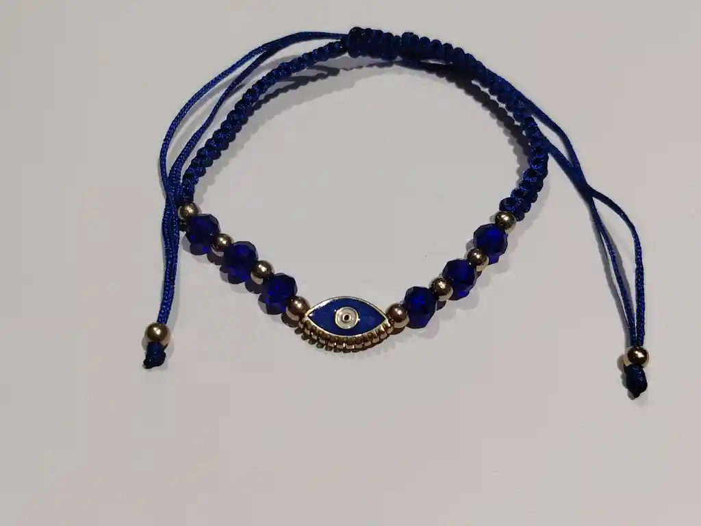 Pulseras de hilo azul con cuencas doradas y azules y de dije central un ojo turco de color azul y borde dorado