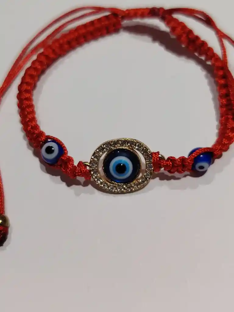 Pulsera de hilo rojo con ojos turcos azules y de dije central un ojo con borde dorado y brillantes