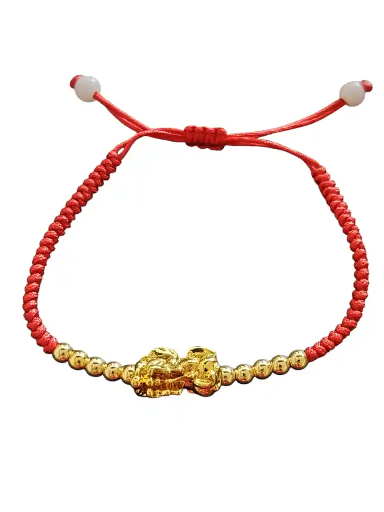 Pulsera ajustable de hilo rojo con delicadas esferas doradas que aportan brillo sutil y sofisticación. Su dije central en relieve destaca como punto focal, elevando el diseño con un aire elegante y simbólico. Una pieza versátil y atemporal, ideal para llevar sola o combinada, perfecta para quienes buscan un accesorio con estilo refinado y significado.