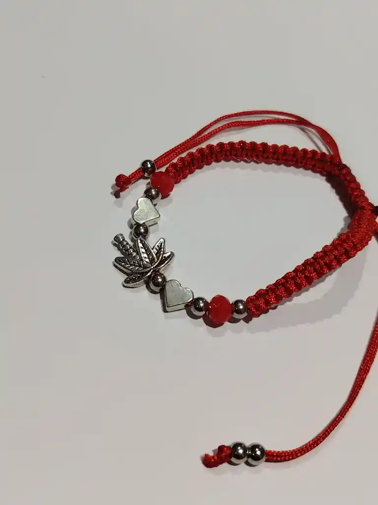 Pulsera de hilo rojo con cuencas en forma de corazon y esferas plateadas y dije centarl deuna hoja cannabis