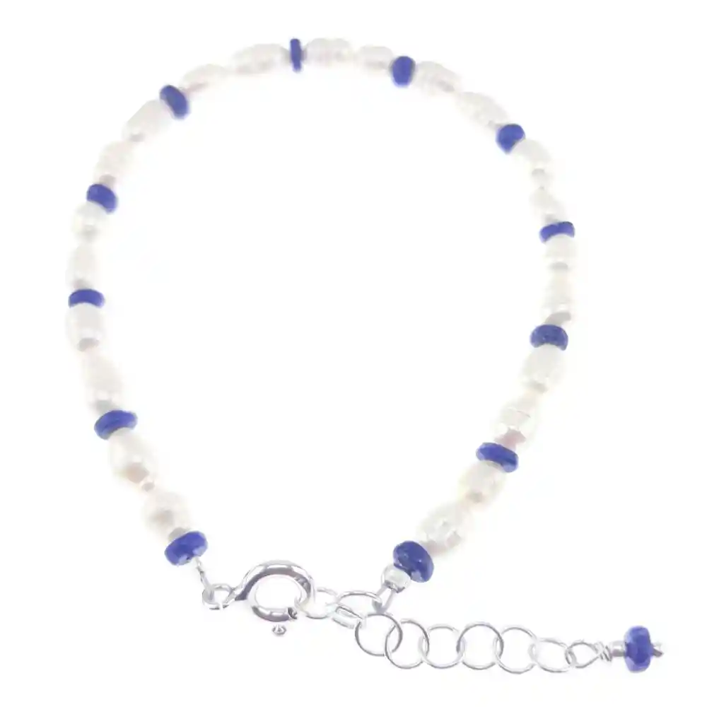 Pulsera de piedra natural de lapislázuli rondel de 0,4 cm. Perla natural de río ovalada de 0,4 cm. Broche, cadena de 2 cm de largo y conector de plata 925. Largo 16 + 2 cm. Lapislázuli: facilita el sueño, transmite paz y serenidad. Perlas de río: elimina todo tipo de miedos y angustias. Plata: Es antibacteriana. Calma los nervios. Potencia la creatividad. Ayuda a liberar las emociones. Incluye: bolsa de regalo Cambios: 1 mes Garantía: 3 meses
