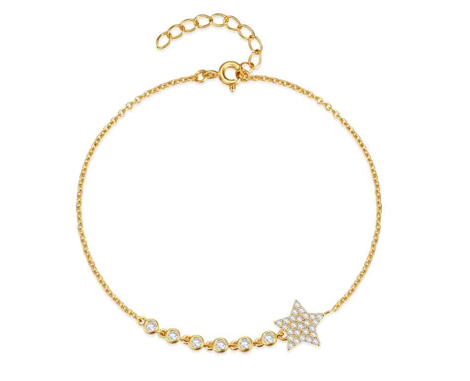 Descubre nuestra elegante pulsera de plata bañada en oro, adornada con una deslumbrante estrella y pequeños circones que brillan con cada movimiento. Este accesorio no solo complementa tu estilo, sino que también añade un toque de glamour y sofisticación a cualquier atuendo. Perfecta para cualquier ocasión, esta pulsera es el regalo ideal para ti o esa persona especial. ¡Luce radiante y destaca con esta joya única!Material, Plata 925 bañada en OroMedida, 17 cm + 5 cm de extensión / 2 grs