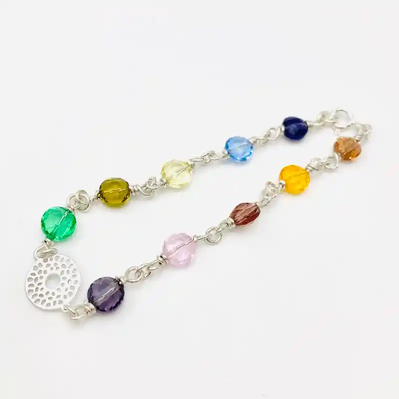 Pulsera de plata, con una mandála al centro y cristales multicolor. Largo 18cm. También te puede interesar