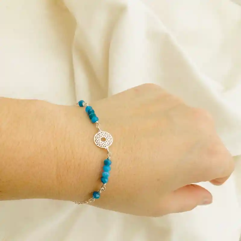 Pulsera con piedras Apatita naturales, con un mandála y cadena de plata. La pulsera mide 19cm/22cm. para ajustar con la cadena. La piedra APATITA es utilizada para fortalecer huesos y dientes, regular el apetito y mejorar el sistema digestivo. Potenciadora de la comunicación y la confianza