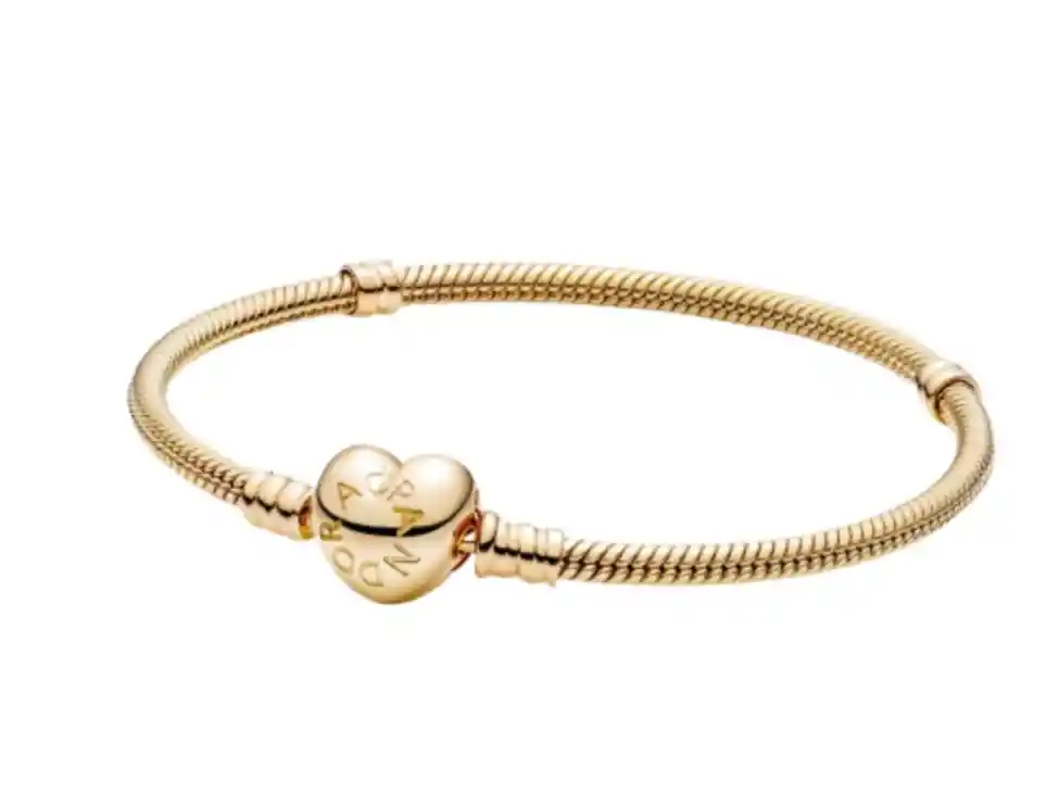 Dale un vuelco a tu corazón con esta versión romántica del superventas brazalete con dijes de Pandora. Acabado a mano con un cierre en forma de corazón, este brazalete de cadena de serpiente de plata esterlina con baño de oro, se ve impresionante por sí mismo, pero aún mejor adornado con sus charms y clips favoritos de Pandora. Póngalo en capas con las pulseras de cadena en contraste para una apariencia elegante y de múltiples capas.