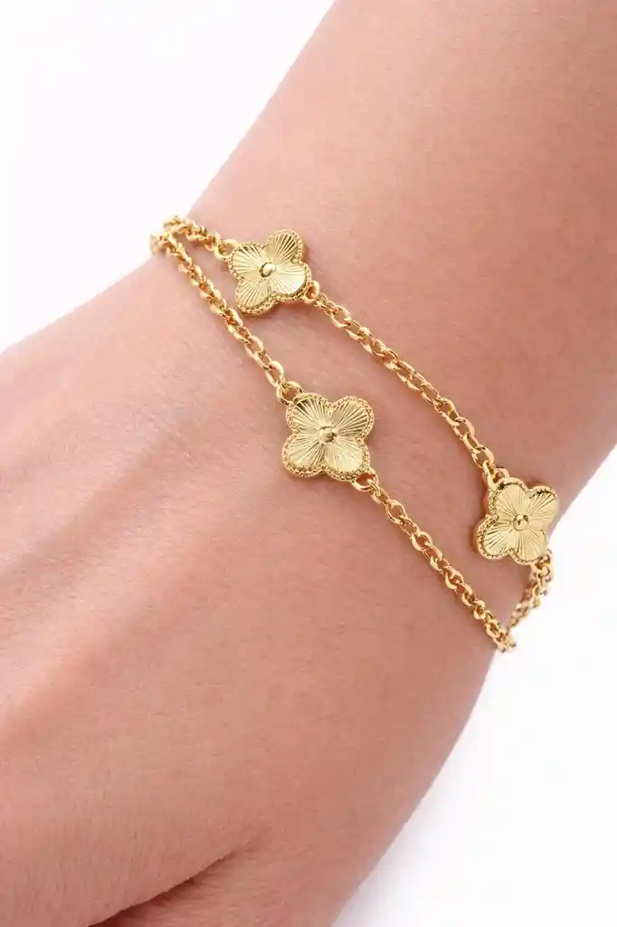 Pulsera de siete tréboles doble laminado en oro de 18k mide 21cm.