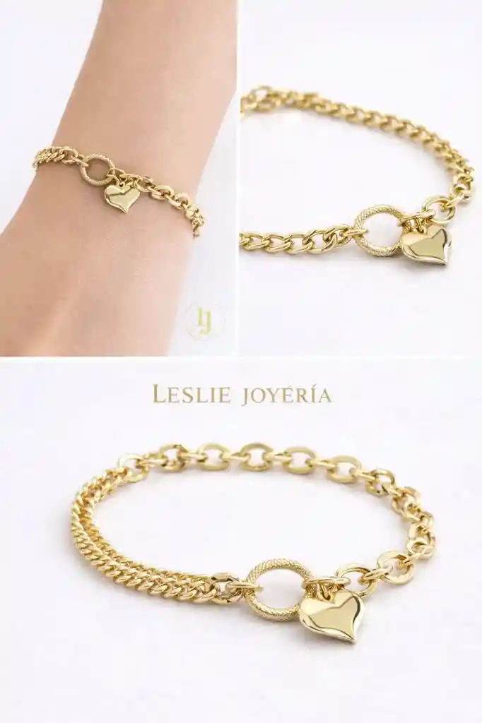 Pulsera doble diseño con corazón inflado laminado en oro 14k mide 23cm