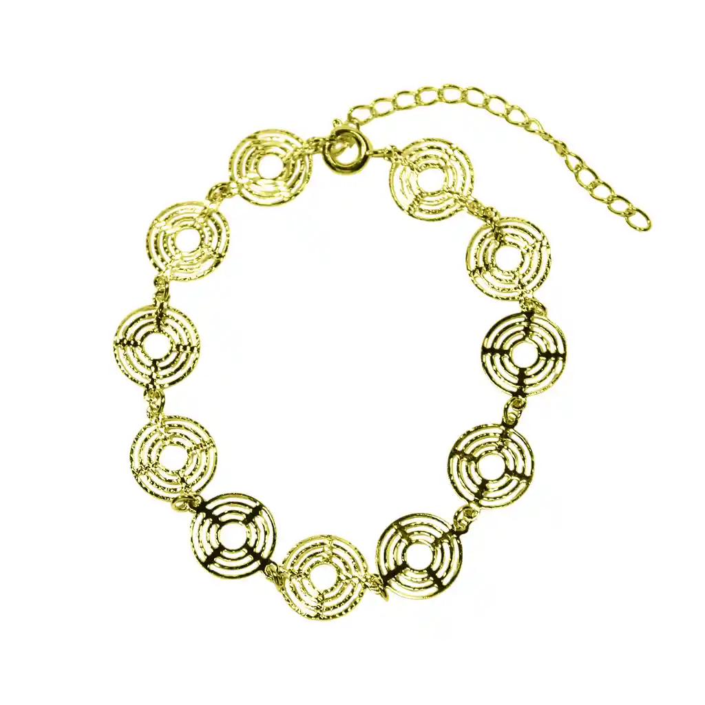 Descubre nuestra pulsera Elena, Enchapada en Oro 18K. Hipoalergénica y libre de níquel, perfecta para un estilo sofisticado y moderno. ¡Hazla tuya y deslumbra siempre! Medidas: Largo total pulsera 17cm más 5cm de extensión. Diámetro de cada círculo 10mm. Peso 2,1 gr.