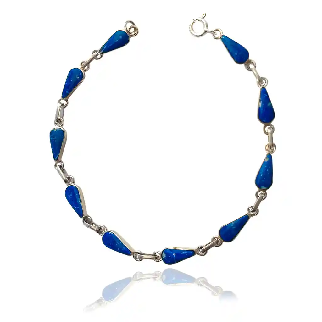 Descubre la belleza de la Pulsera Gota Lapislázuli en Plata Fina 925. Un accesorio elegante que agrega un toque de sofisticación a cualquier look. Debido a que la piedra es natural, su color puede variar ligeramente respecto al mostrado en la imagen referencial. Medidas: Largo total de la pulsera 19cm. Tamaño gotas 10x4mm. Pesa 5.3 gr.