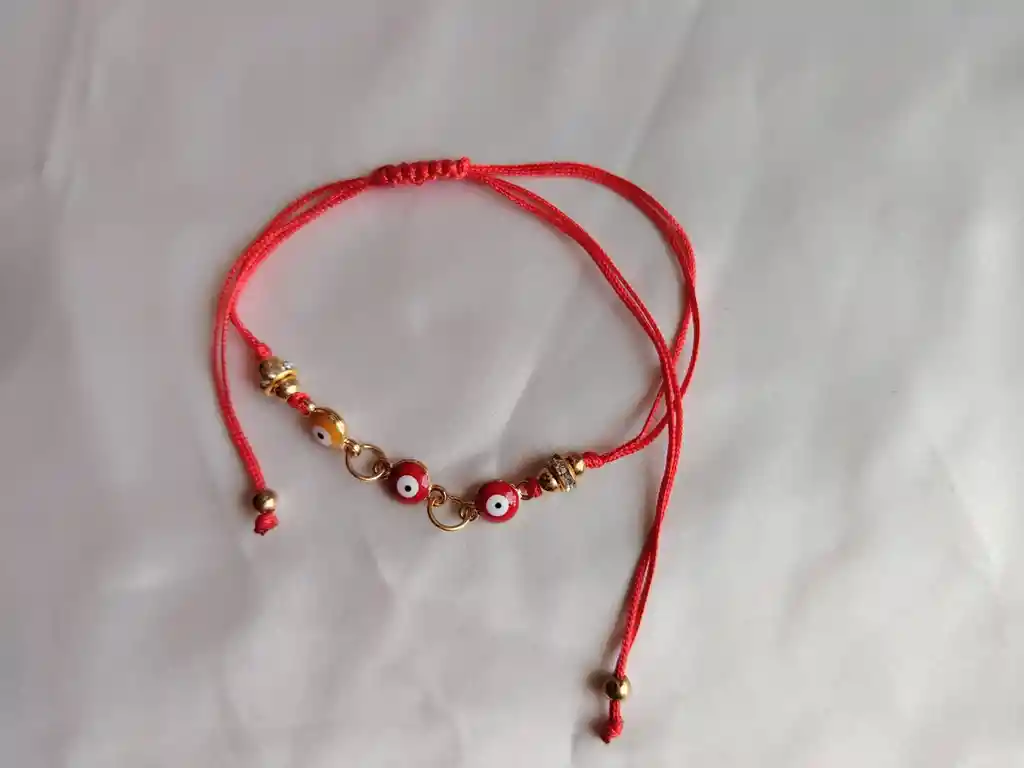 Pulsera de hilo rojo con cuentas de ojo y detalles dorados. Un diseño delicado que simboliza protección y buena energía, ideal para uso diario.