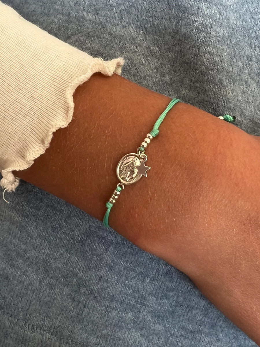Preciosa pulserita de hilo verde agua ajustable, con Virgencita de los Rayos (es la Virgen milagrosa) de 9 x 11 mm (sin argollas)y estrellita, enchapados en plata, libre de níquel e hipoalergénic