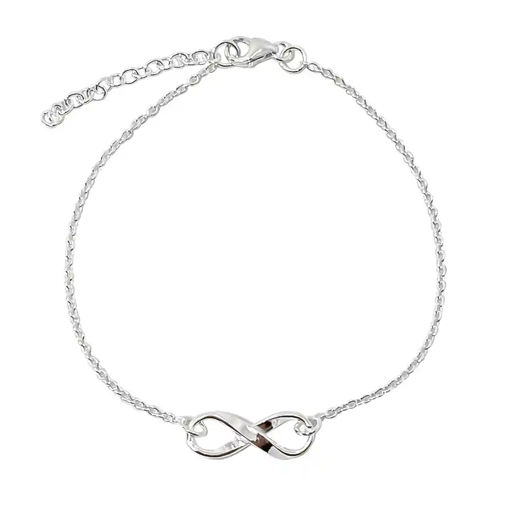 Pulsera infinito torcida, fabricada en plata fina ley 925, sólida. Su calidad es garantizada y libre de níquel. Sus medidas son un largo de 16+3cm de cadena de extensión de la pulsera. El infinito es de 6mm de largo y 16mm de ancho. Tiene un peso de 1,5 gr.