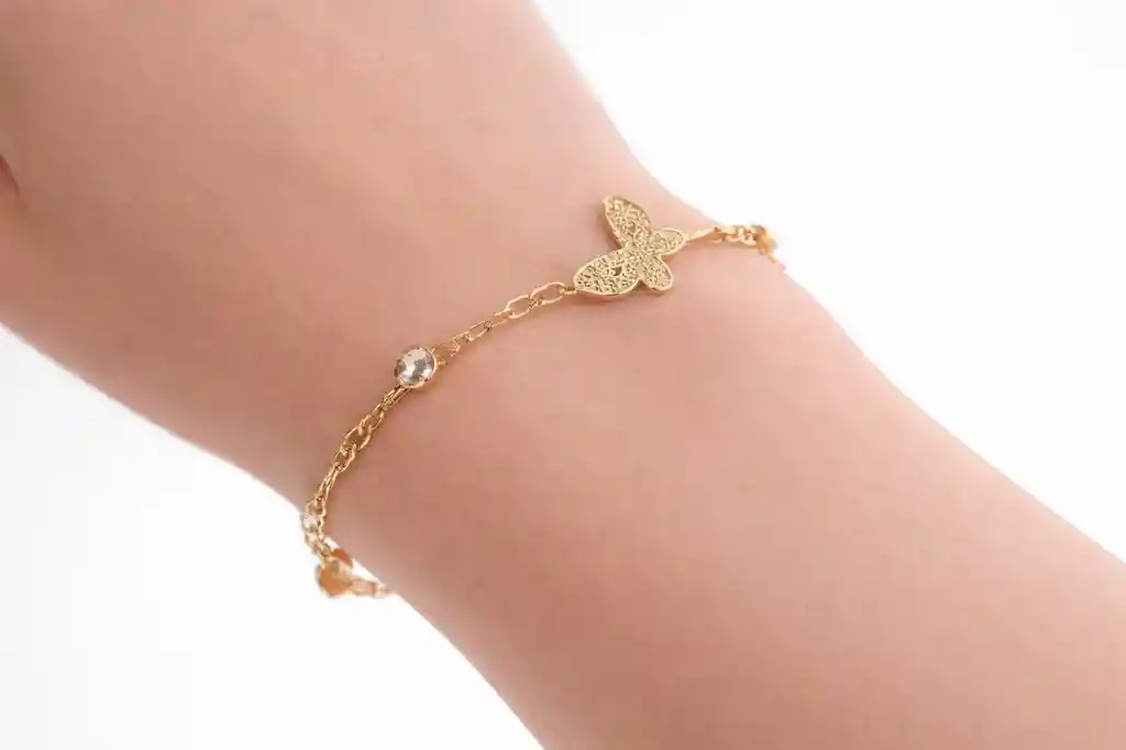 Pulsera mariposa y cristales laminado en oro de 18k mide 19cm.