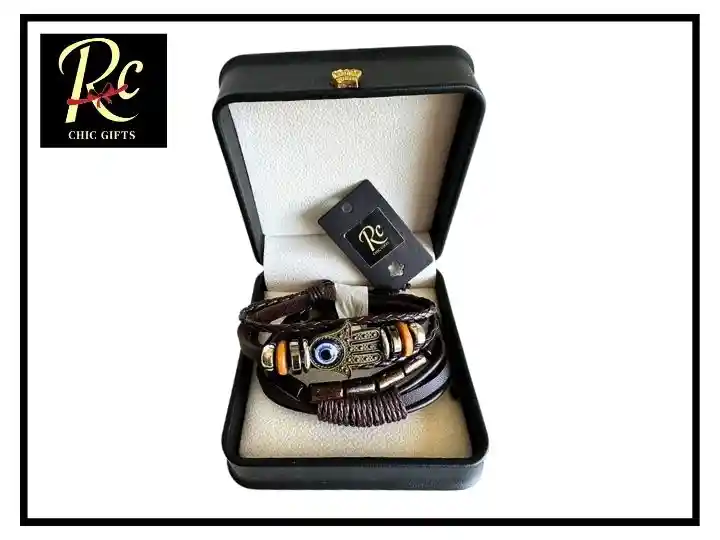 "Protección, estilo y significado en un solo accesorio. Esta pulsera marrón para hombre combina cuero trenzado, cuentas decorativas y un dije de Mano de Hamsa con Ojo Turco, reconocido como talismán universal que aleja las malas energías, el mal de ojo, la envidia y atrae buena suerte y fortuna. Su diseño multicapas transmite carácter y espiritualidad, mientras el estuche de lujo con corona dorada refuerza el impacto visual desde el primer momento. Fabricada en República Dominicana, fusiona tradición artesanal con estética contemporánea. Disponible en Regalos Chic, especialistas en regalos corporativos y exclusivos. Regalo para hombre Pulsera Mano de Hamsa Pulsera con Ojo Turco Pulsera marrón cuero hombre Pulsera de protección masculina Regalos corporativos premium Pulseras fabricadas en República Dominicana Regalos Chic Chile"