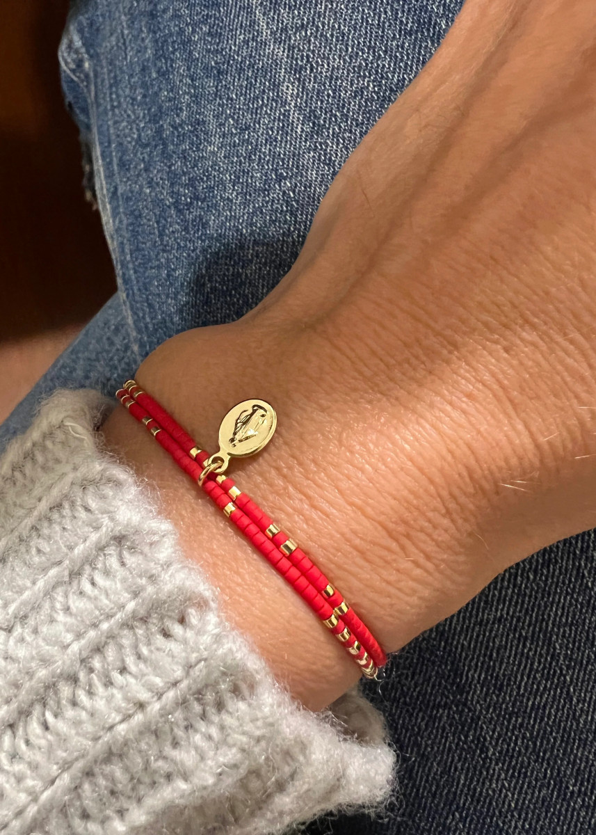 Pulsera hilada a mano con miyuki de color rojo-oro rojo-plata y colgante de virgencita de los rayos de 6 x 8 mm enchapada en oro o plata según elección. Es ajustable ya que tiene nudo corredizo.Hay dos opciones; puedes elegir simple o doble.p