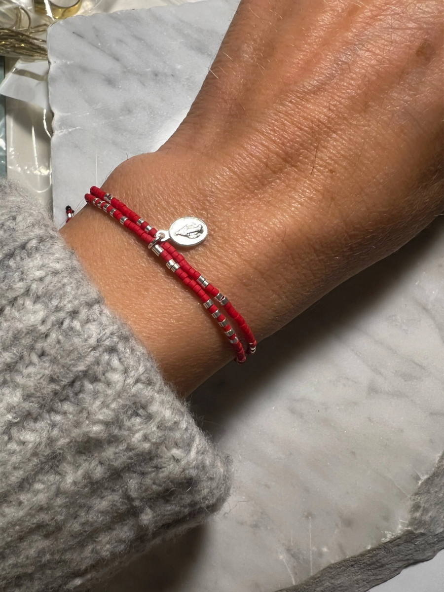 Pulsera hilada a mano con miyuki de color rojo-oro rojo-plata y colgante de virgencita de los rayos de 6 x 8 mm enchapada en oro o plata según elección. Es ajustable ya que tiene nudo corredizo.Hay dos opciones; puedes elegir simple o doble.p