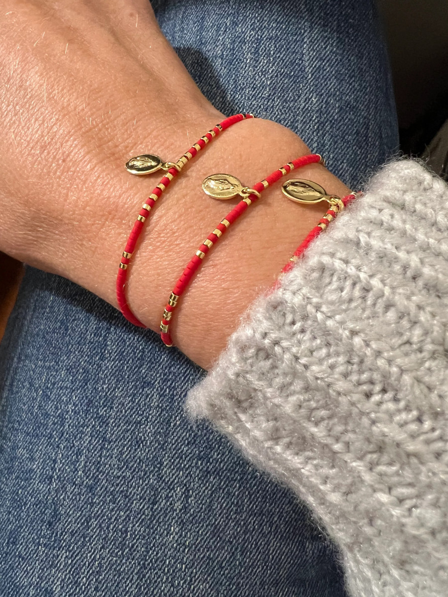 Pulsera hilada a mano con miyuki de color rojo-oro rojo-plata y colgante de virgencita de los rayos de 6 x 8 mm enchapada en oro o plata según elección. Es ajustable ya que tiene nudo corredizo.Hay dos opciones; puedes elegir simple o doble.p