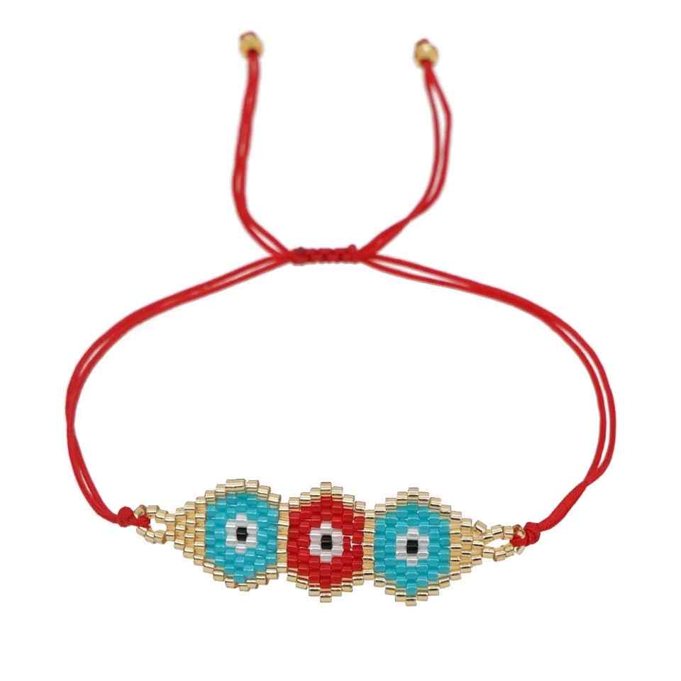 La pulsera MIYUKI ROJA 3 OJOS es una elegante y llamativa pieza de joyería que cuenta con tres ojos de mostacillas. Hecha a mano con materiales de alta calidad, esta pulsera no solo es un accesorio que complementará cualquier atuendo, sino que también es un amuleto de protección contra el mal de ojo. Añade un toque único y significativo a tu look con esta hermosa pulsera.