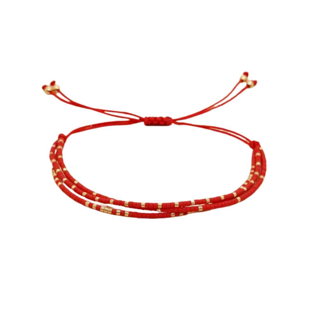 Esta pulsera roja triple Miyuki está hecha con mostacillas rojas y detalles en dorado. Cada pieza está hecha a mano y ofrece un estilo único. La combinación de colores proporciona un toque elegante y llamativo a cualquier conjunto. Perfecta para agregar un toque de color y sofisticación a tu look diario.