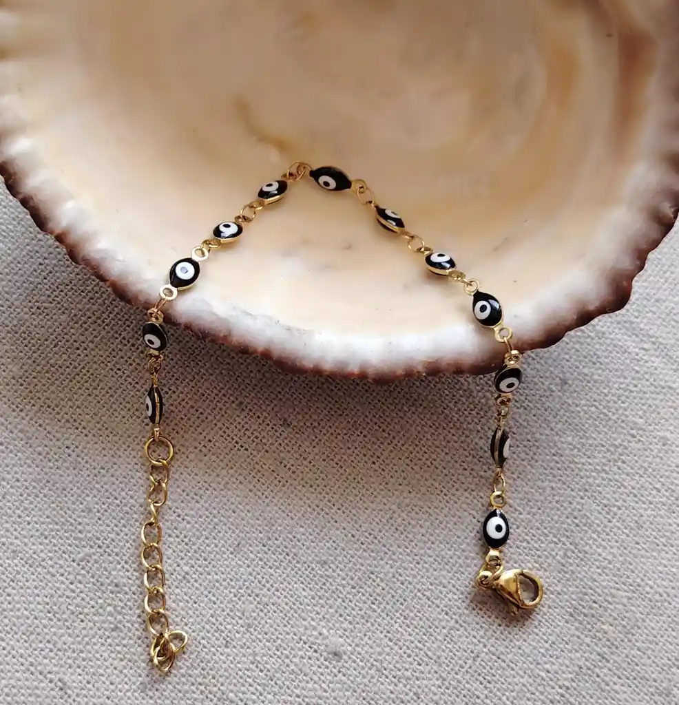 Pulsera fina con dijes de ojo negro sobre cadena bañada en oro. Un diseño elegante y minimalista, ideal como amuleto de protección para el día a día.