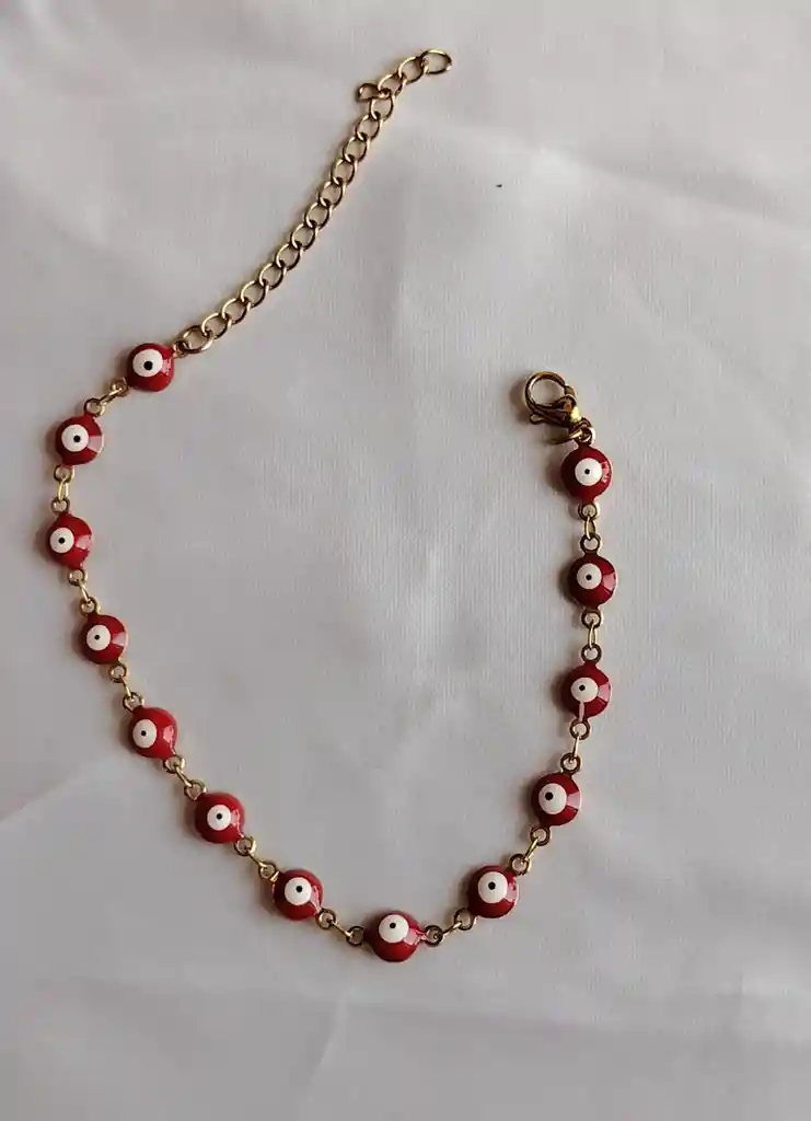 Pulsera delicada con dijes de ojo rojo y cadena bañada en oro. Un diseño llamativo que combina protección y estilo para el uso diario.