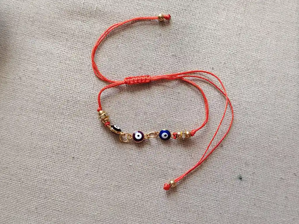 Pulsera de hilo rojo con ojitos protectores y detalles dorados. Un amuleto delicado que aporta protección y buena energía en el día a día.