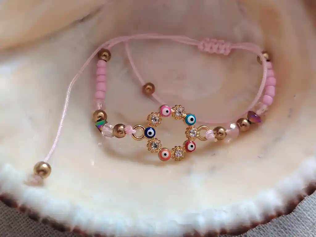 Pulsera de hilo rosado con dije circular de ojos multicolor y detalles dorados brillantes. Delicada y protectora.