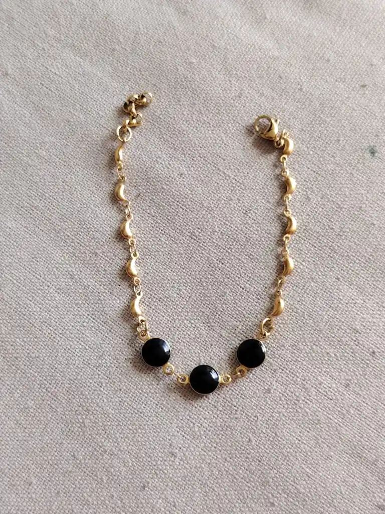 Pulsera delicada con piedras negras tipo ónix y detalles bañados en oro, elegante y fácil de combinar.