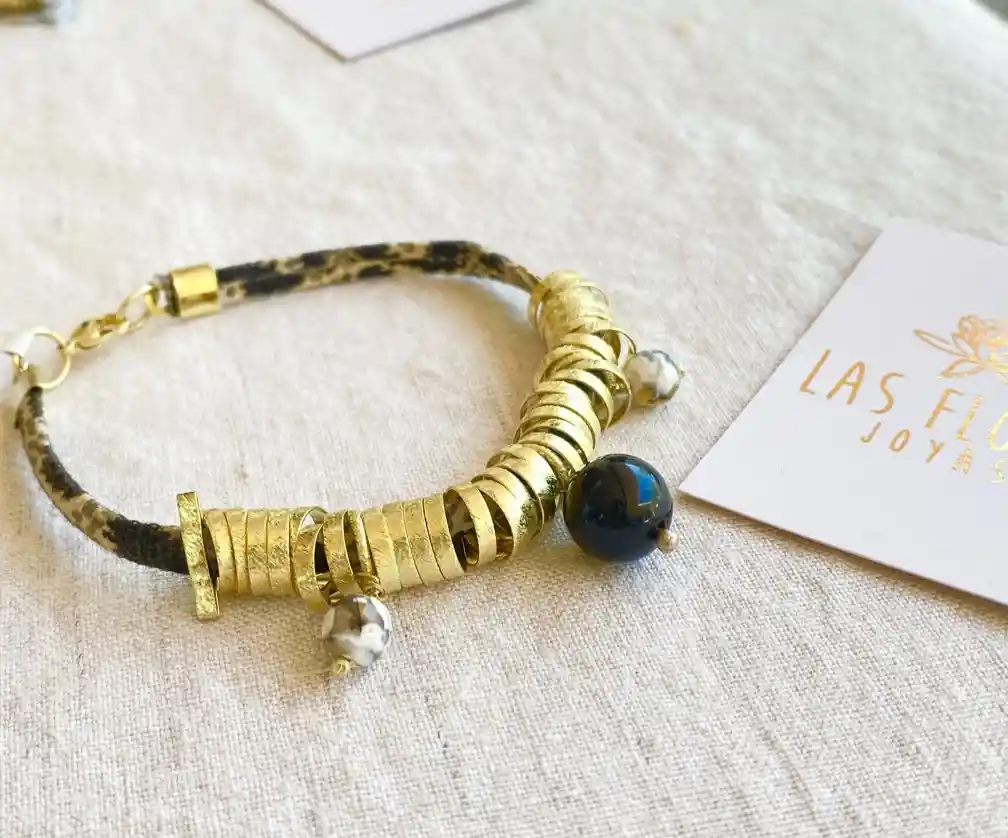 Hermosa y original pulsera, hecha a mano por nosotras. Fabricados con materiales duraderos, resistentes al desgaste, e hipoalergénicos. Ideal para darle un toque especial a tu look. Características: Materiales: Cuentas y herrajes enchapados en oro 18k, libres de níquel, con piedra onix.