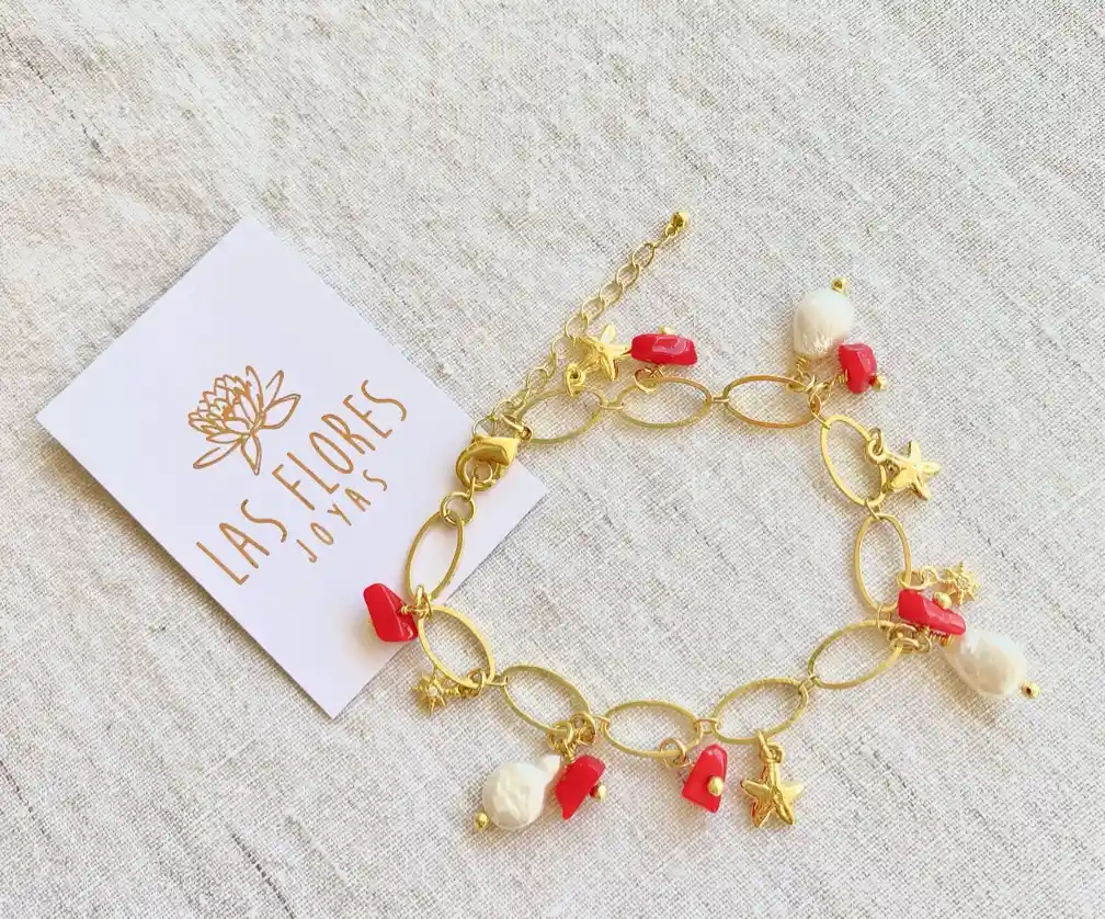 Hermosa y original pulsera, hecha a mano por nosotras. Fabricados con materiales duraderos, resistentes al desgaste, e hipoalergénicos. Ideal para darle un toque especial a tu look. Características: Materiales: Cuentas y herrajes enchapados en oro 18k, libres de níquel, con perlas y corales.