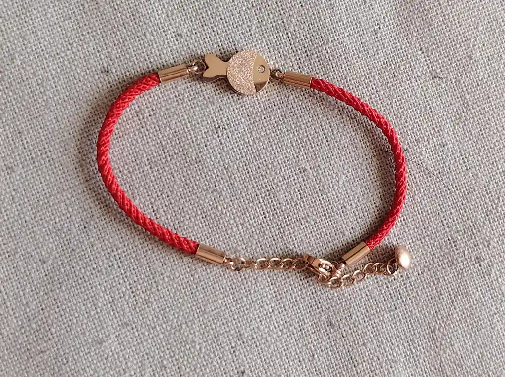 Pulsera de hilo rojo con dije de pez y detalles dorados. Un amuleto delicado de protección y buena energía.