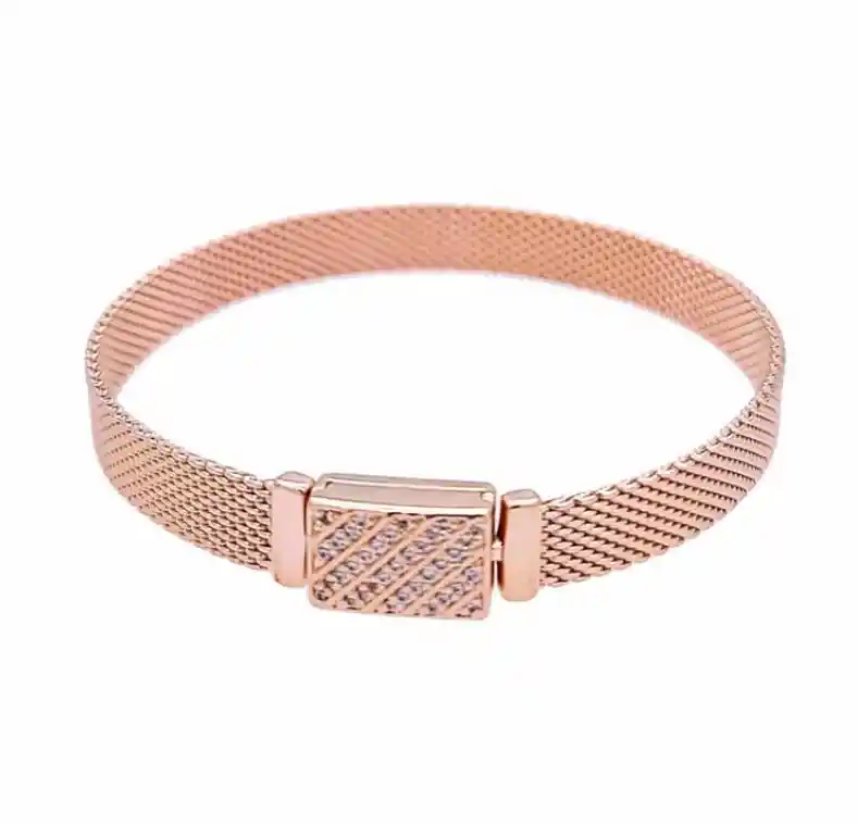 Reflexión es una forma moderna de reflejar quién eres. Este brazalete de malla plana de la colección sostiene sujetadores que quedan al ras y reflejan tu estilo, sea cual sea la forma que éste tome, nuestra mezcla única de metales enchapada en oro rosa que le brinda un acabado rosado, esta pieza se ve igual de impresionante tanto si se usa sola como si se apila con otras brazaletes. Teje tu historia en tu estilo y luce dorada y audaz agregando tus charms favoritos de la colección.